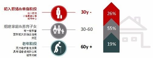 3、进入60岁以上阶段,人们开始逐步再次转向租房市场。主要原因在于孩子长大成人离家之后,人们不愿意或没有足够能力维护自住房屋,尤其在75岁之后,老年人开始选择具有养老设施的公寓。这一阶段人们多住在城市内部。