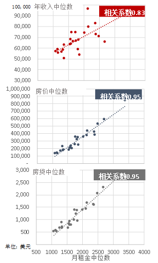 图:2017年6月美国主要都会区租金水平与家庭收入、房价、房贷的相关性