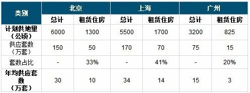 北京未来五年计划供应租赁住房50万套,年均10万套,2017年供地计划中,租赁住房用地剔除公租房用地后,租赁住房用地供应200公顷,约提供7.4万套住房,与之对比,今年以来北京成交的自持地块带来的租赁住房套数占比在20%左右。上海在“十三五”期间租赁住房供应70万套(这部分租赁住房中不涵盖保障房中的租赁性住房),年均14万套,今年以来供应量仅约占计划供应的10%。广州未来五年计划供应15万套租赁住房,年均3万套,今年以来成交的自持地块带来的租赁住房不足2000套,远低于计划供应量。