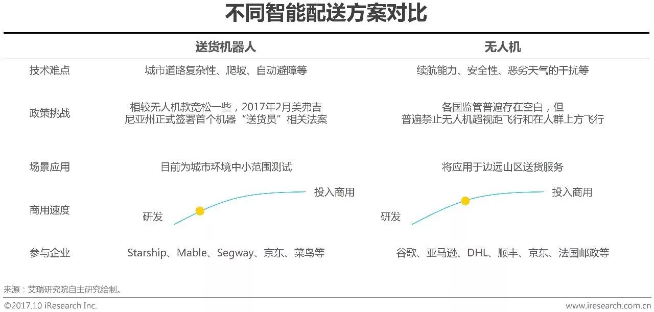 物流精细化运营后,末端配送的成本和效率成为优化重点,物流公司不约而同将最后一公里的物流配送寄托在机器人身上,阿里和京东相继推出自主研发的送货机器人。无人机方面,顺丰、京东、邮政等也纷纷加快布局动作。就实际应用来看,送货机器人技术尚未成熟,最大难点在于城市道路的极其复杂,加上承载量较小,目前各家投入比例相对小于无人机领域。而无人机技术已经相当成熟,目前最大的阻碍来自政策监管,一旦政策放开后,大规模的商用将会迅速普及。