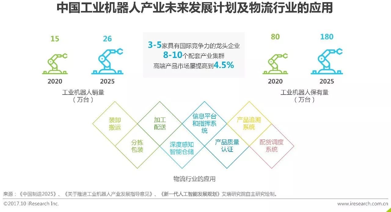 自2013年来,我国已成为全球最大的机器人消费国,但国产机器人的份额仅占约三成的份额,且处于行业低端,高端机器人主要依赖进口,具有自主研发能力,可以生产关键零部件或机器人产品的企业仅百家左右。随着人工智能技术的成熟,机器人产业的重要性日益提高,国家相继发布《关于推进工业机器人产业发展指导意见》、《中国制造2025》、《关于推进工业机器人产业发展指导意见》等多部政策,明确了十三五期间的发展目标,预示工业机器人即将迎来广阔发展前景。