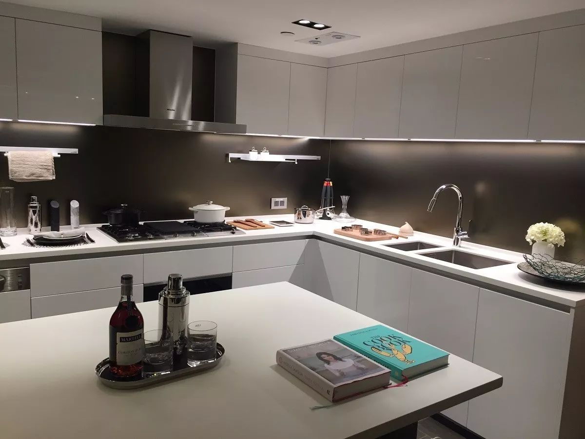 很多厨房都设置了感应式照明,晚上来厨房找吃的不用开大灯。另外在橱柜的在橱柜的内侧配一排灯带,可以方便做饭时候看清。