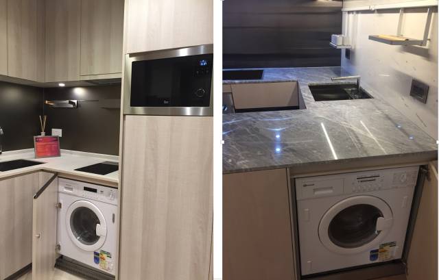 香港住宅洗衣机也会嵌入到厨房的地柜中,因为香港的房子一般很少设计阳台,即使有,也非常小或者不规整。一方面政府出于美观度考虑,另一方,跟内地阳台是按一般面积来计算不同,香港的阳台是按全面积收费,所以阳台对于他们而言是可有可无的奢侈品,即使有阳台,也非常小,放了一台洗衣机就基本上没空间了。