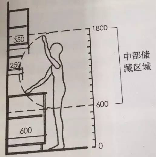 橱柜收纳中最应该利用的是中部区域。中部局域指距离地面600-1800mm的范围,是以人肩为轴,上肢半径活动的范围,是存取物品最方便,使用频率最高,也是人视线最易看到的区域。