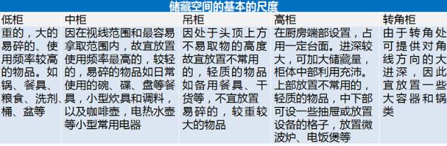 厨房储藏空间的各组成部分的尺寸应根据人体尺度、活动范围及相关的设备的尺寸要求来确定。