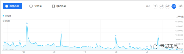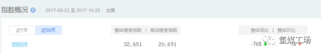 氢媒工场从百度指数上也获得了类似的结论。百度指数显示,《阴阳师》近半年来搜索指数(除几次游戏活动节点外)都在屡创新低,已从最高峰的13万降至目前的2万;另外百度指数还显示,近30天,《阴阳师》整体搜索指数同比降低了76%。
