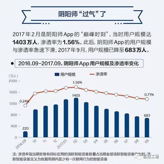 10月19日,据界面新闻报道,极光大数据发布了《2017年9月阴阳师App研究报告》,报告显示,2017年9月份《阴阳师》用户规模为683万,不足峰值时(1403万)的一半。