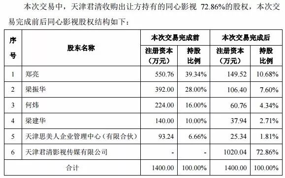 完美世界披露的公告显示,通过下属并购基金君毅云扬之子公司天津君清影视,完美世界与郑亮、梁振华、何炜、梁建华及天津思美人企业管理中心签订协议,以7.07亿元的价格购买了同心影视72.86%的股权。