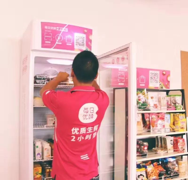 今年6月,「每日优鲜便利购」业务上线,便利购替代了传统茶水间,将冷藏柜、常温货架和冷冻柜(冬日有热储柜搭配)搬到办公室,白领们可扫码自取。如果消费者还需要其他线上商品,可从每日优鲜商城订购,形成线上线下闭环。便利购和主商城流量可以相互转化。便利购同样共享每日优鲜的整个供应链和后台数据,系统代替人工来计算仓库商品的补货需求,保证近千款商品在每一个前置仓中损耗和售罄的平衡,由专人负责一日一次到两次补货及设备维护。