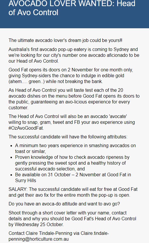 这是澳大利亚招聘网站Seek上最新贴出的一条招聘启事,职位要求中没有对应聘者的学历、性别、年龄等背景提出限制要求,只说要找符合要求的牛油果专家。这则启事一经发布就引起了围观,通过网络,已有不少澳大利亚甚至海外的牛油果爱好者们把简历投递给了用人单位:Good Fat(好脂肪)餐厅。