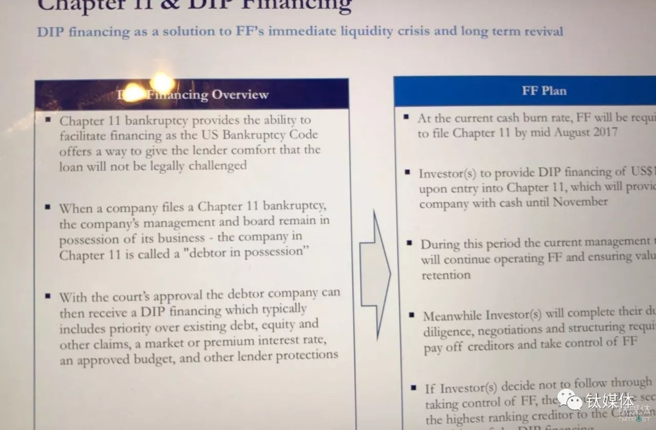 其实这家叫Farady Future的汽车公司已经停摆很久了,根本没有生产,也不知道那些所谓的几千名员工都在哪里,做着什么,FF越来越像一家影子公司,有朋友去做了考察,也就呵呵了。而贾跃亭也在努力寻求着变相出售FF汽车的计划。这个变相出售计划,是其在美国破产法院申请对陷入重大债务危机和现金流困境的FF进行破产重整计划(DIP Financing),利用的是美国最著名的破产保护法Chapter 11,又称第11章破产保护法。