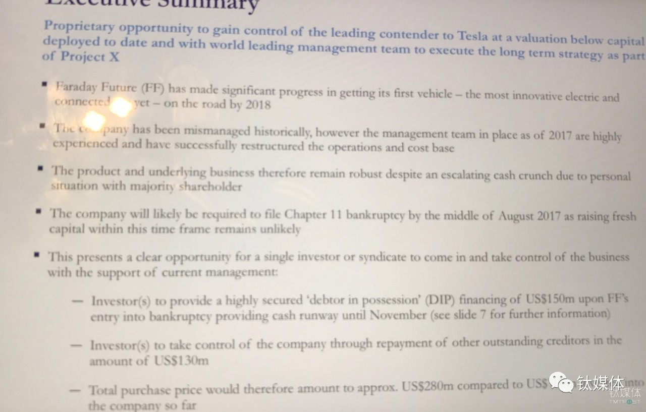 但是真实情况呢?真实情况是,当时(2017年7月,根据融资计划书,8月向美国破产法庭申请破产保护)贾跃亭正要向美国联邦破产法院申请FF的破产,且通过破产重整把公司卖给其他投资人,自己退出。计划真是完美的,对外博取“情怀造车”之名,对内还是要认认真真想着怎么赶紧甩手。