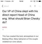 而 Blind 里也有员工称,二人之间确实有“越界”发展亲密关系(该工程主管此前为已婚身份,今年已办理离婚手续),左右了葛宏对员工投诉工程主管一事的处理决定,此事“在北京办公室里制造了有毒的氛围,违反了Airbnb 的价值观。”
