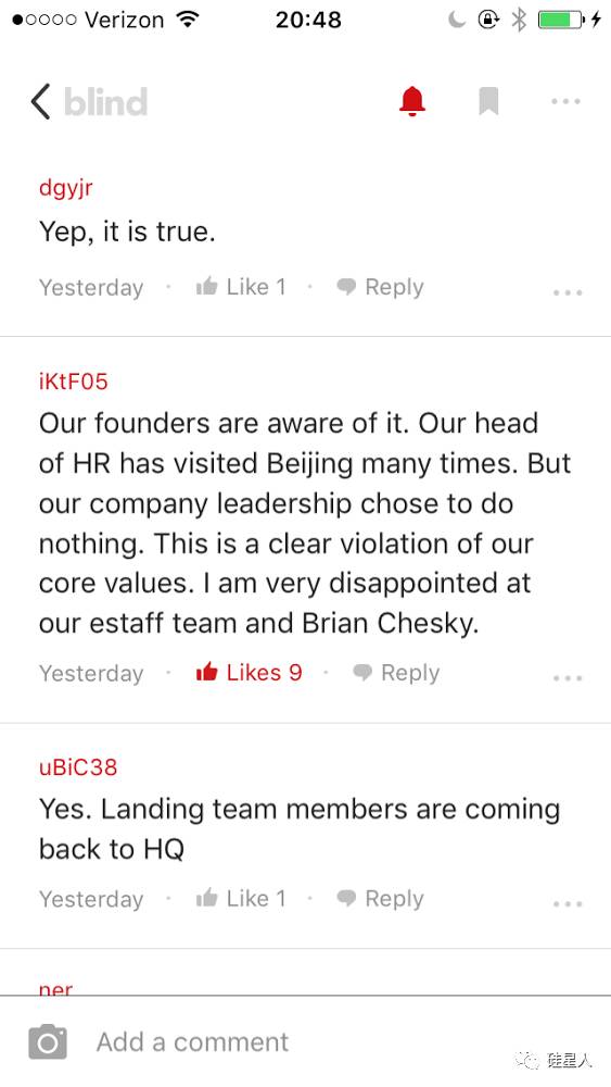 创始人知道这件事。HR 主管来过北京很多次了。我们的公司最终还是决定什么都不做。这事是对我们价值观的践踏。我对高管层和布莱恩·切斯基( Airbnb 联合创始人兼 CEO)十分失望。