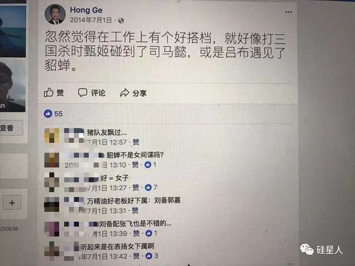 二人在 Facebook 的工作时间重合了三年六个月,合作已久。2014 年,葛宏就在自己 Facebook 账号上发表贴文,称与搭档合作愉快。评论中已经有人点透,葛宏表扬的是谁(图片来自知乎匿名回答,为保护无关人士打码)