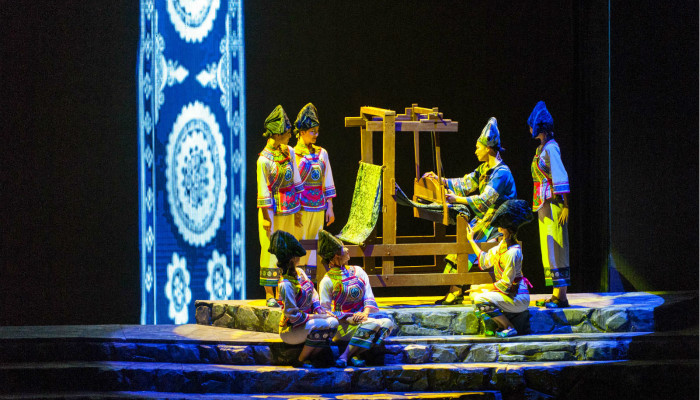 “侗族大歌寂天籁,苗家飞歌动地容。”10月26日晚,大型歌舞诗《多彩和鸣》在上海大剧院开启第十九届中国上海国际艺术节的“爱我中华 多彩贵州”贵州文化周系列活动。《多彩和鸣》民族歌舞主题展演选择了贵州具有代表性的苗族、布依族、侗族、彝族、水族五个民族20余个非物质文化遗产项目,编为《彝风烈焰》、《布依情韵》、《水族遗音》、《侗声悠扬》、《苗岭古风》等五大篇章,各个篇章不仅展现各个民族的精湛民间技艺,诸如彝族漆器制作、布依族服饰制作、水书习俗、侗族木结构建筑营造技艺及苗族银饰锻造等,还表演了作为非物质文化遗产的民族传统歌舞,其中彝族古剧、水族水书舞蹈、侗族情歌都令人印象深刻。