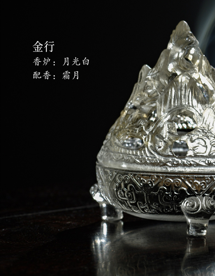 五行中,秋属金,代表稳固、收敛,月白、露白、霜白,秋风扫落叶。我们把月光白笼罩在琉璃博山炉上,沉香缭绕间,是中秋满月下的缕缕云烟。