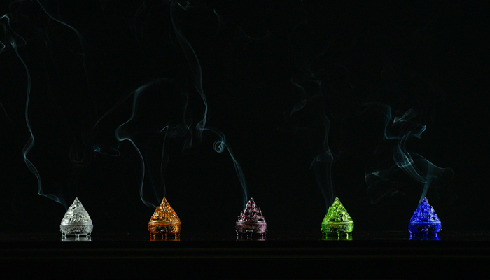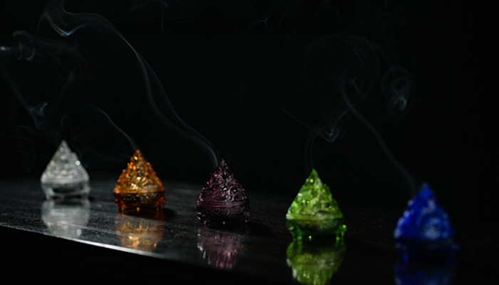 2.0版博山炉不仅按五行数术,为琉璃配出五行色系,还将此前的单一盘香,做了一系列升级,并新增了五款对应人体嗅觉感应的五行盘香。