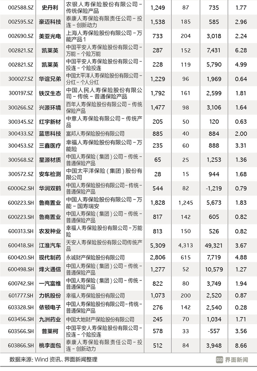 界面新闻梳理发现,共有144个险资账户新晋成为121只个股前十大流通股东。