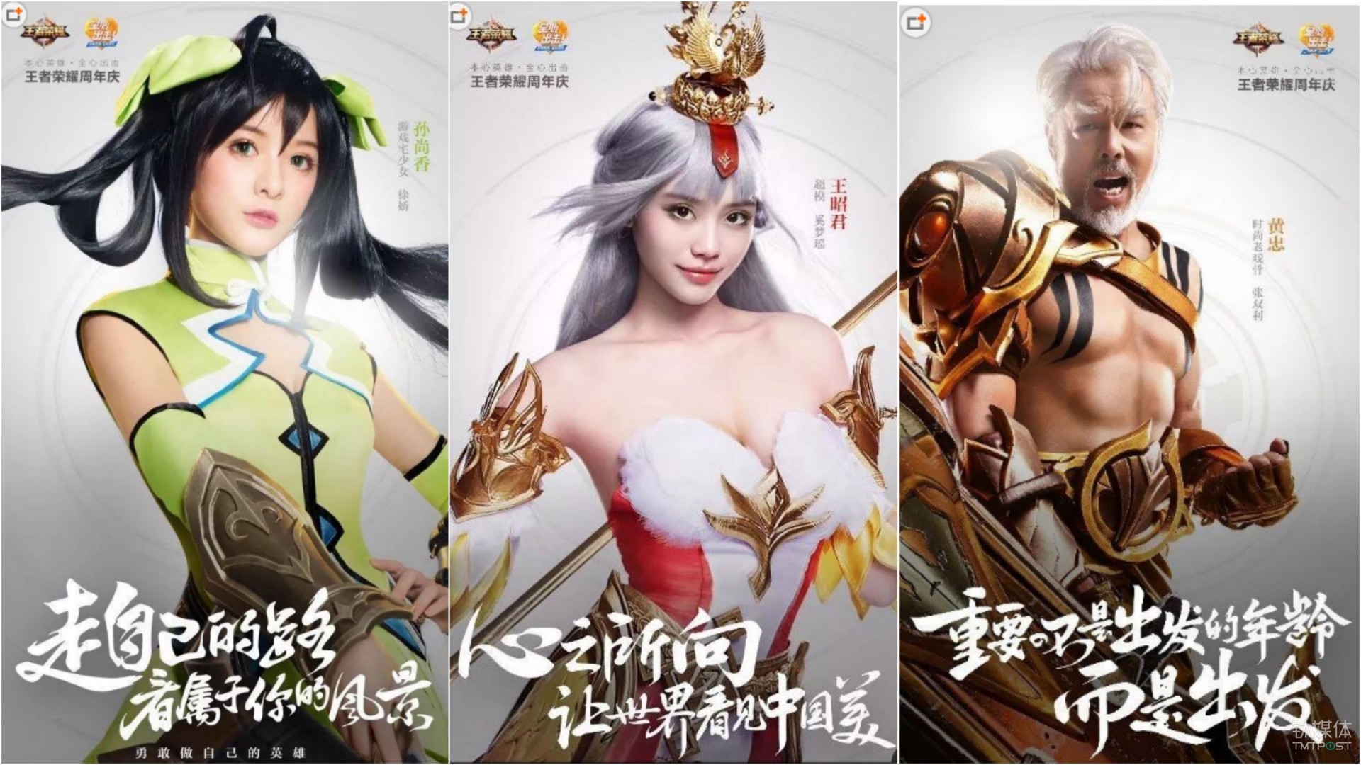 明星Cos英雄角色海报,包括徐娇Cos孙尚香、奚梦瑶Cos王昭君、张双利Cos黄忠