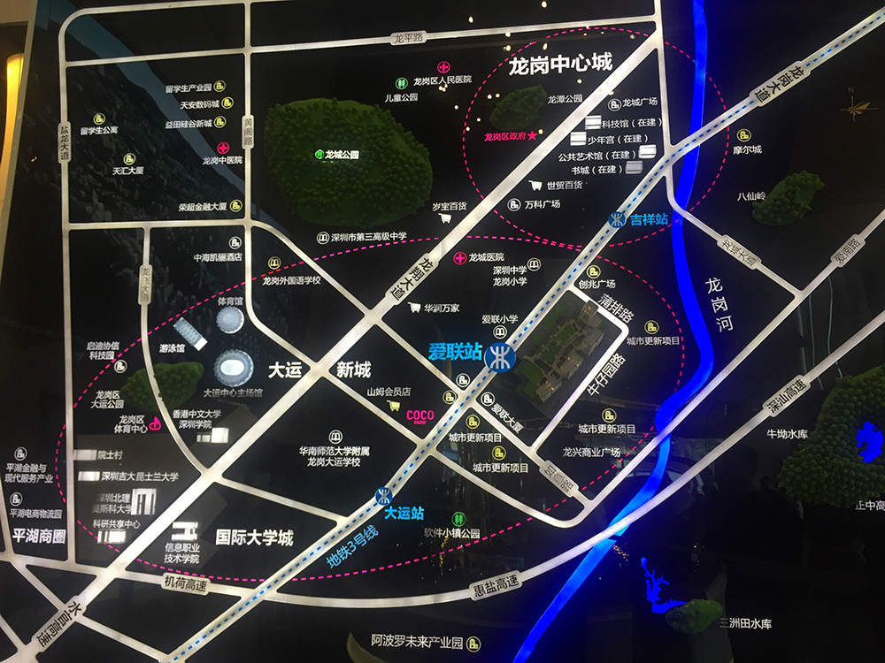 交通方面,项目紧邻3号线“爱联站”,仅一站即可在“大运站”换乘规划中的14号快线,到罗湖的清水河约规划5站,到福田的黄木岗约规划6站,预计龙中和福田的距离将缩短至30分钟以内。同时,爱联地铁站公交车站也是深圳交通网络重要站点之一,途径的公交线路多达20余条。