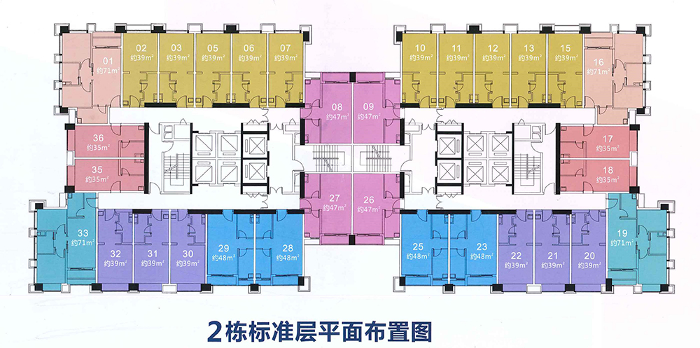 据销售人员介绍,项目共有4栋,1栋A、B、C为商办产品,本月开售的楼盘为2栋。整栋楼分为互不相连的AB两个单元,每栋44层。由于1、2层为商业,3层为入户大厅,14、29层为避难层,实际可居住的楼层只有39层。每层设6梯16户,共备案1247套,整体备案均价约为3.4万/平,所有产品交楼带4000元精装修。