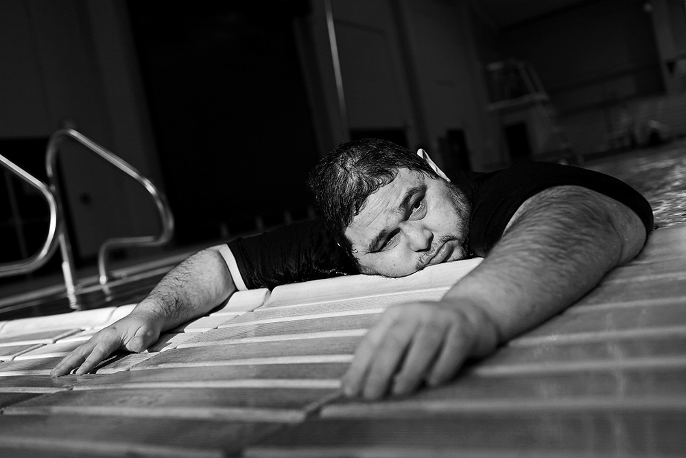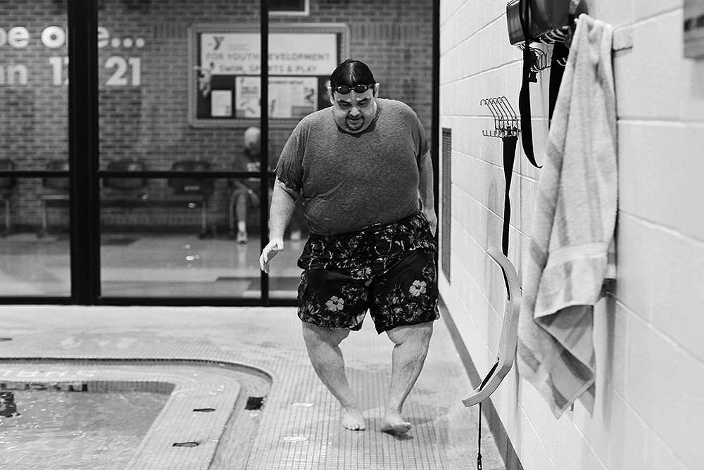 第一次在游泳池走圈后,Garcia趴在泳池边缘休息。肥胖可引起骨性关节炎,除了体重增加关节负重外,还与肥胖引起的姿势、步态及运动习惯的改变有关。