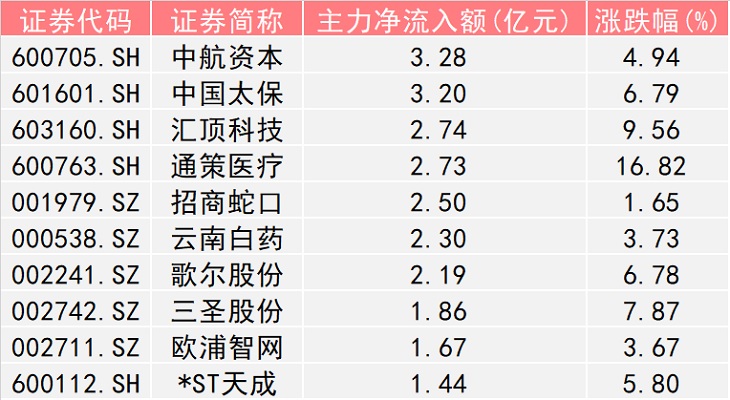 统计数据显示,,本周获主力资金持续净流入且五日累计净流入额超过1亿元的个股共有13只。其中,中航资本(600705.SH)、中国太保(601601.SH)、汇顶科技(603160.SH)、通策医疗(600763.SH)、招商蛇口(001979.SZ)、云南白药(000538.SZ)和歌尔股份(002241.SZ)七只个股累计主力净流入额均超过2亿元。