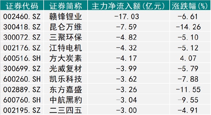 在本周主力资金持续净流出个股中,共计有63只个股累计主力净流出额超过1亿元。赣锋锂业(002460.SZ)、昆仑万维(300418.SZ)、三聚环保(300072.SZ)、江特电机(002176.SZ)和方大炭素(600516.SH)五只个股本周累计主力净流出额均超过4亿元。其中,赣锋锂业本周主力资金累计净流出高达17.03亿元。