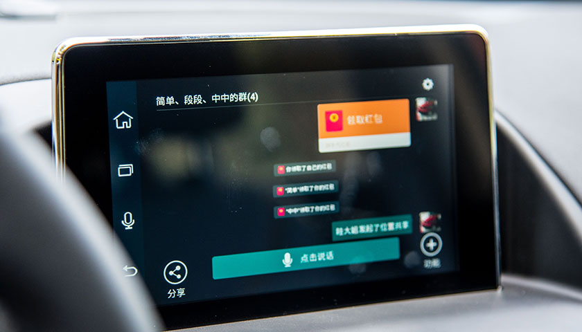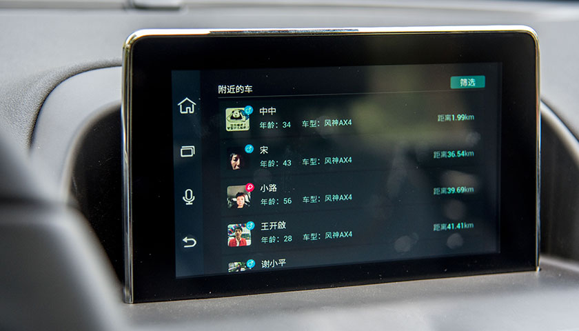 相对后排,AX4前排副驾则有更多乘坐乐趣。这主要基于AX4所搭载的WindLink互联网汽车智能系统。除了相对常见的“在线导航”、“在线音乐”、“网络电台”等功能之外。AX4所搭载的这套系统还具备了社交功能。诸如我们平时微信上常用的“群聊”、“语音聊天”,甚至“收发红包”都可以实现。