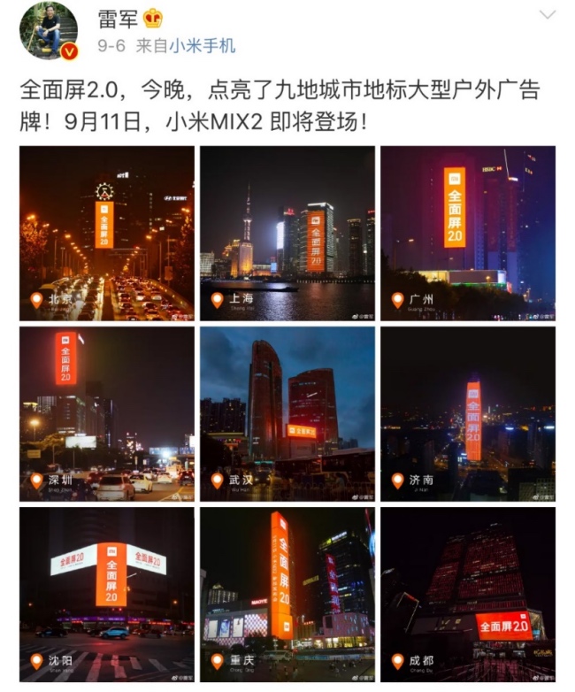 2017年9月6日,雷军在微博上晒出了9大城市的小米MIX2大型户外广告牌。除了满眼的传统橘色VI外,同样的广告位都曾经出现过OV的影子... ...