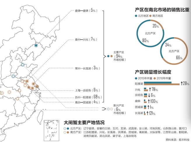 “过去大家对大闸蟹的认识更多停留在阳澄湖这一产区,一方面是渠道局限,阳澄湖大闸蟹除了有很多专营店,在超市卖场这些地方也是总被追捧。其他产区的大闸蟹在知名度上逊色得多了之后,身价自然不及阳澄湖大闸蟹。不过阳澄湖大闸蟹‘十买九假’是业内熟知的。电商竞赛蔓延到大闸蟹后,对我们这样非阳澄湖产区的蟹农来说肯定是利好的。培养了消费者的同时,对物流成本的控制也更有利。今年环保、印刷等成本都在上升的情况下,一票大闸蟹的价格还能维持在40~50元。”位于太湖产区的蟹企负责人崔伟向第一财经记者透露。