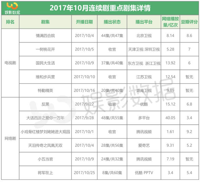 数据来自娱影连续剧系统,统计截至2017年10月28日。