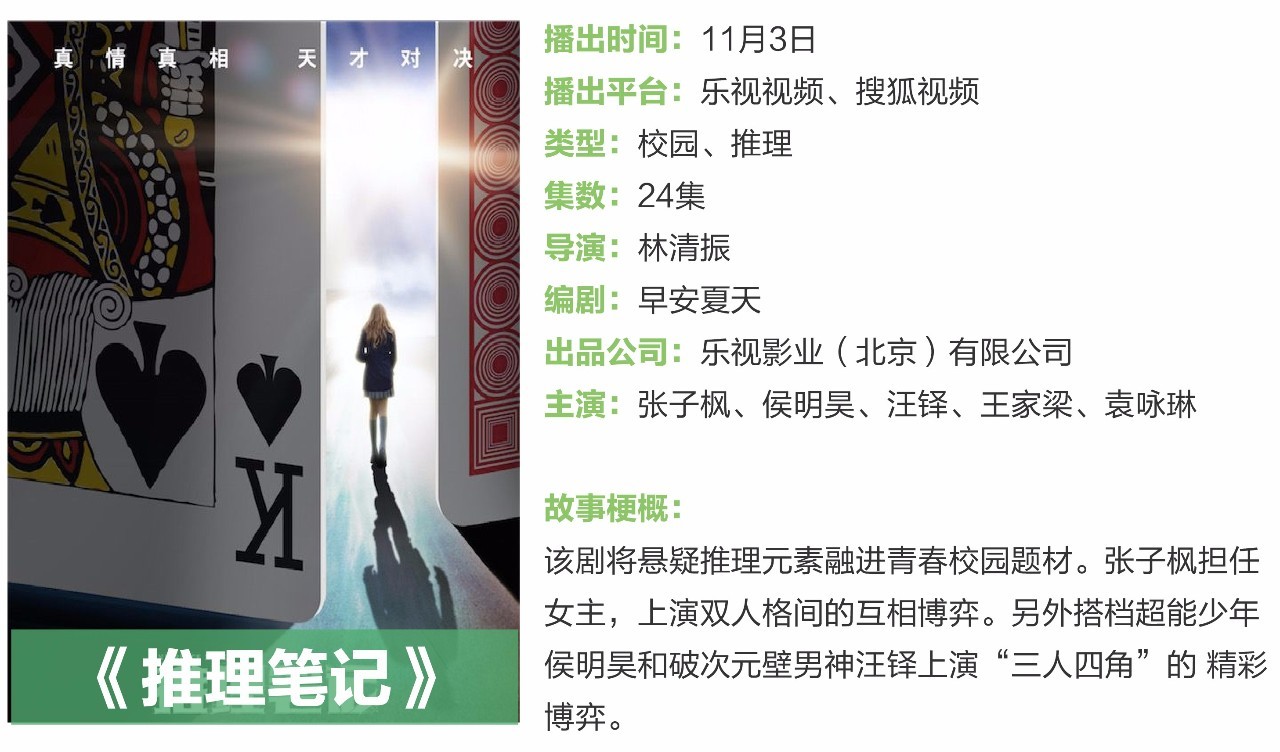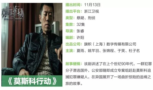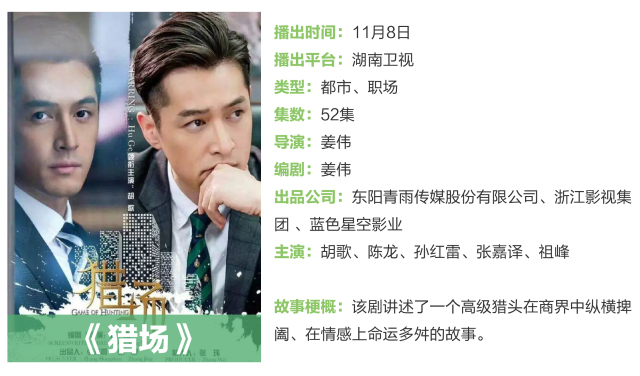 在一系列主旋律剧过后,十月末十一月初的连续剧题材变得多样化起来,除了女性观众偏爱的古装、都市和轻松的青春剧外,还有家庭剧、刑侦剧等。再加上胡歌、张嘉译、夏雨等实力演员的回归,以及马思纯、关智斌、安悦溪等年轻演员的倾情演绎,如此精彩的剧集,一定可以满足观众的不同口味。