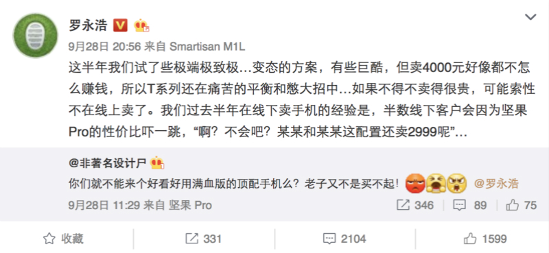 “这半年我们试了些极端极致极…变态的方案,有些巨酷,但卖4000元好像都不怎么赚钱,所以T系列还在痛苦的平衡和憋大招中…如果不得不卖得很贵,可能索性不在线上卖了。我们过去半年在线下卖手机的经验是,半数线下客户会因为坚果Pro的性价比吓一跳,‘啊?不会吧?某某和某某这配置还卖2999呢’…”