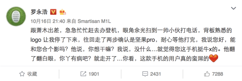 “跟萧木出差,急急忙忙赶去办登机,眼角余光扫到一帅小伙打电话,背板熟悉的 logo 让我停了下来,往回走了两步确认是坚果pro,耐心等他打完,我说您好,能和您合个影吗?他说,你想干嘛?我说,没什么…就觉得您这手机挺牛x的。他翻了翻白眼,你丫有病吧?就走开了…你看,这款手机的用户真的蛮屌的 ”