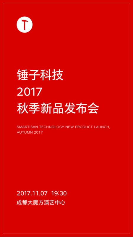 10月30日晚,锤子科技官方公布2017秋季(公历)新品发布会将于11月7日(周二)晚7:30在成都大魔方演艺中心举行。