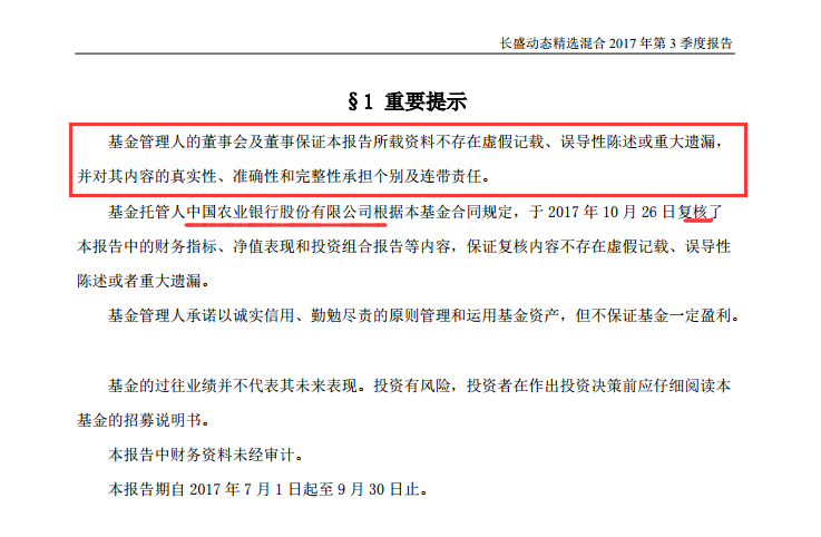在公募行业,作为向基金持有人披露基本信息的文件,基金产品定期报告的真实性和准确性是基本要求。报告中也称:基金管理人的董事会及董事保证报告所载资料不存在虚假记载、误导性陈述或重大遗漏,并对其内容的真实性、准确性和完整性承担个别及连带责任。基金托管人中国农业银行也会在定期报告发布前复核相关报告书。