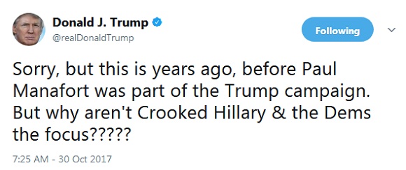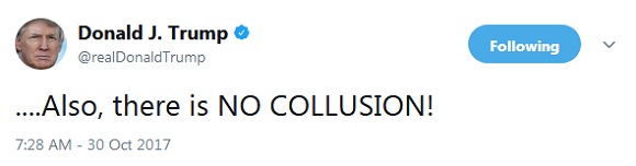 对于“通俄调查”周一出现的新进展,特朗普依然坚持之前的立场:“没有合谋”,他在推特上发文说:“对不起,但这是多年前的事情了,是在马纳福特成为特朗普竞选团队一员之前。但为什么狡诈的希拉里和民主党没成为调查焦点呢?还有,不存在合谋!”