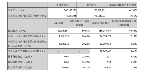 其中三季度美的营收为624.98亿元,报告期内比上年同期增加60.85%,归属上市公司股东的净利润为41.86亿元,同比增加26.43%。