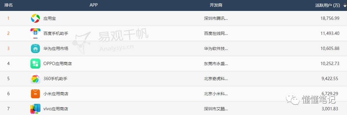 目前,华为、小米、OPPO、vivo等手机厂商的应用商店已经明显呈现出活跃用户高速增长的态势。从易观千帆的相关数据可以看出,目前华为、OPPO的应用商店仅次于腾讯应用宝和百度手机助手,分别列第三和第四位,而小米、vivo则紧随其后列第六、第七位。