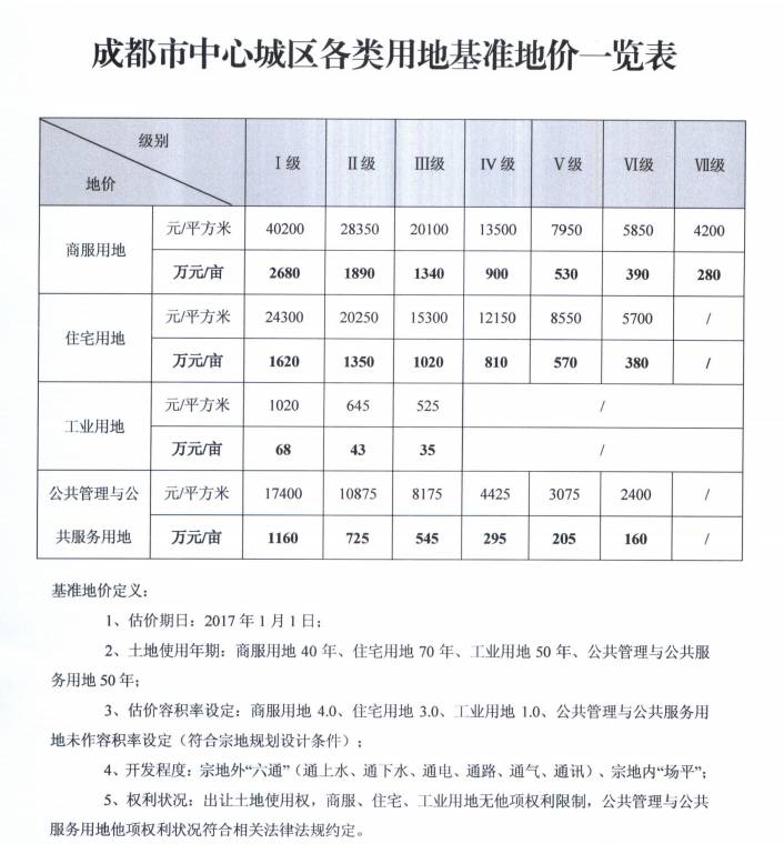 四、成都中心城区执行最新基准地价,一级住宅用地基准价24300元/平——趋稳