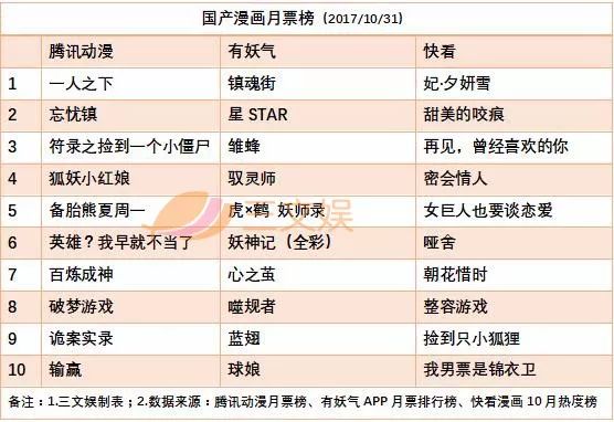 漫画方面,由于月票榜统计时限由月改为周,腾讯动漫本月月票榜有不小的变动,数部连载时间不长的新作品闯入前十。国庆期间,夏达的重新出道之作《拾遗录》也正式上线快看漫画。
