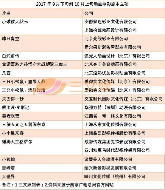 9月下旬到10月上旬立项的动画电影中出现了不少熟悉的面孔,如光线影业的《昨日青空》、华强方特的《熊出没》新电影。