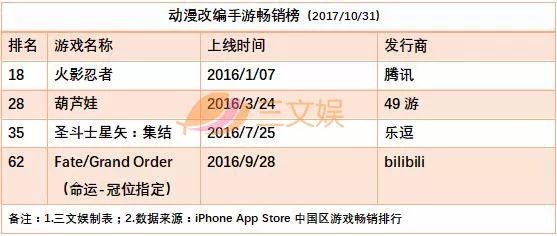 本月动漫改编手游进入畅销榜前100名的仅有四款,而且与上月完全相同,只是顺序有所调整。葫芦娃作为国产原创IP改编的游戏,一直是畅销榜常客,本月其他3款进入畅销榜前100名的漫改手游均为日本经典IP改编。此前曾经短暂上榜的《十万个冷笑话》手游也只有在暑期同名动画电影上映时才有亮眼的表现,电影热度一过手游随即冷却。