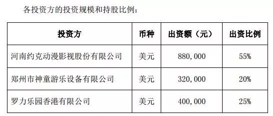 公告显示,罗力乐园注册资本为160万美元,其中,约克动漫以自有资金出资88万美元,占注册资本的55%;郑州市神童游乐设备有限公司出资32万美元,占注册资本的20%;罗力乐园香港有限公司出资40万美元,占注册资本的25%。罗力乐园将主营与公司动漫形象相关的室内儿童乐园项目。