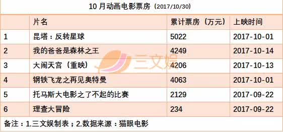 本月上映的动画电影没有成人向作品,均为少儿低幼向电影,票房冠军为《昆塔:反转星球》这部3D科幻片,刚过5000万元,成绩最惨淡的《理查大冒险》仅为234万。
