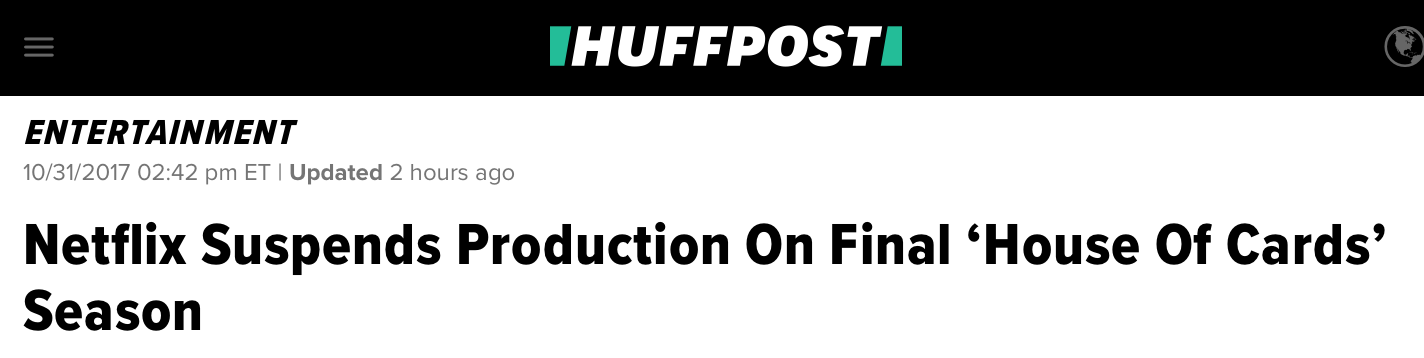 Netflix在和工作室Media Rights Capital的联合申明中说,《纸牌屋》的制作将会暂停“直到后续通知,以能给他们时间审视现状并解决演员和工作人员的任何问题”。在周一发布的申明中,Netflix和工作室说对于史派西的指责使他们“深受困扰”。关于暂停《纸牌屋》制作的决定源于BuzzFeed发布来自演员安东尼·拉普(Anthony Rapp)对史派西的指责。拉普说史派西曾在1986年的一次聚会上对他进行性骚扰,当时拉普仅14岁,史派西26岁。