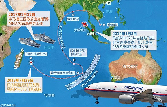 2014年3月8日,从马来西亚吉隆坡前往中国北京的马航MH370客机失联,机上载有239名乘客和机组成员,其中有154人为中国乘客。2015年1月29日,马来西亚民航局宣布MH370失事,并推定机上所有人员遇难。