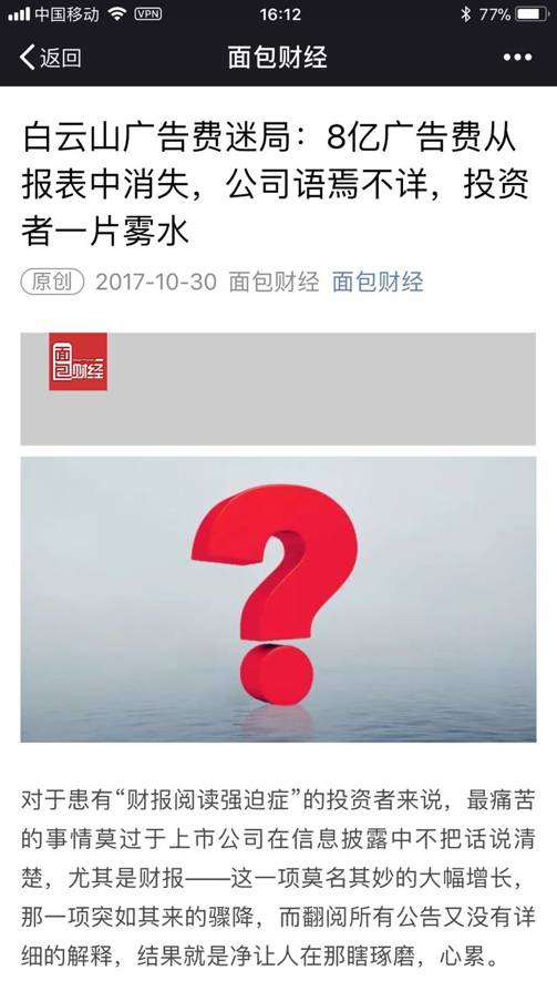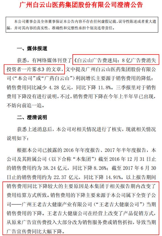 虽然白云山只在公告中说“有网络媒体刊登了《白云山广告费迷局:8亿广告费消失 投资者一片雾水》的文章”,并没有指明是哪家媒体,但是我们心知肚明,指的就是10月30日上午,面包财经的原创文章。
